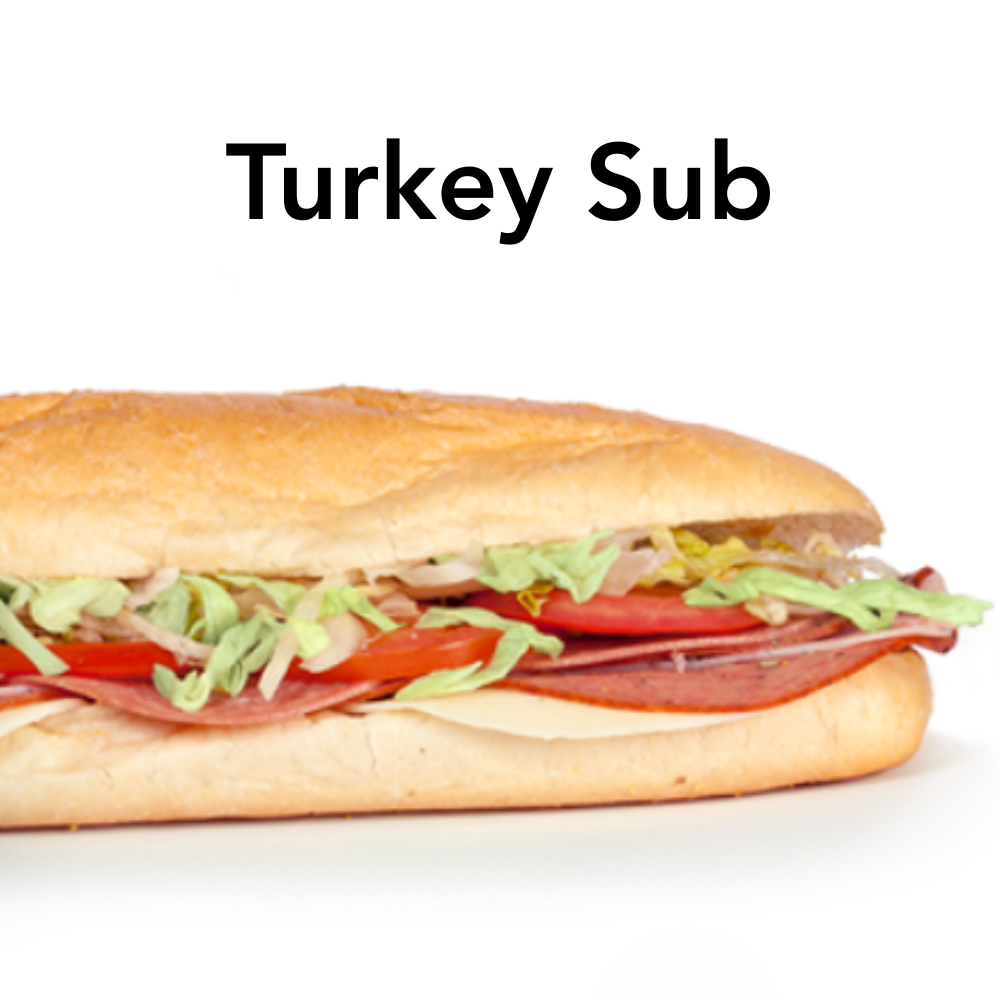 Turkey Sub – includes Turkey, American Cheese, lettuce, tomato, and condiment packet.